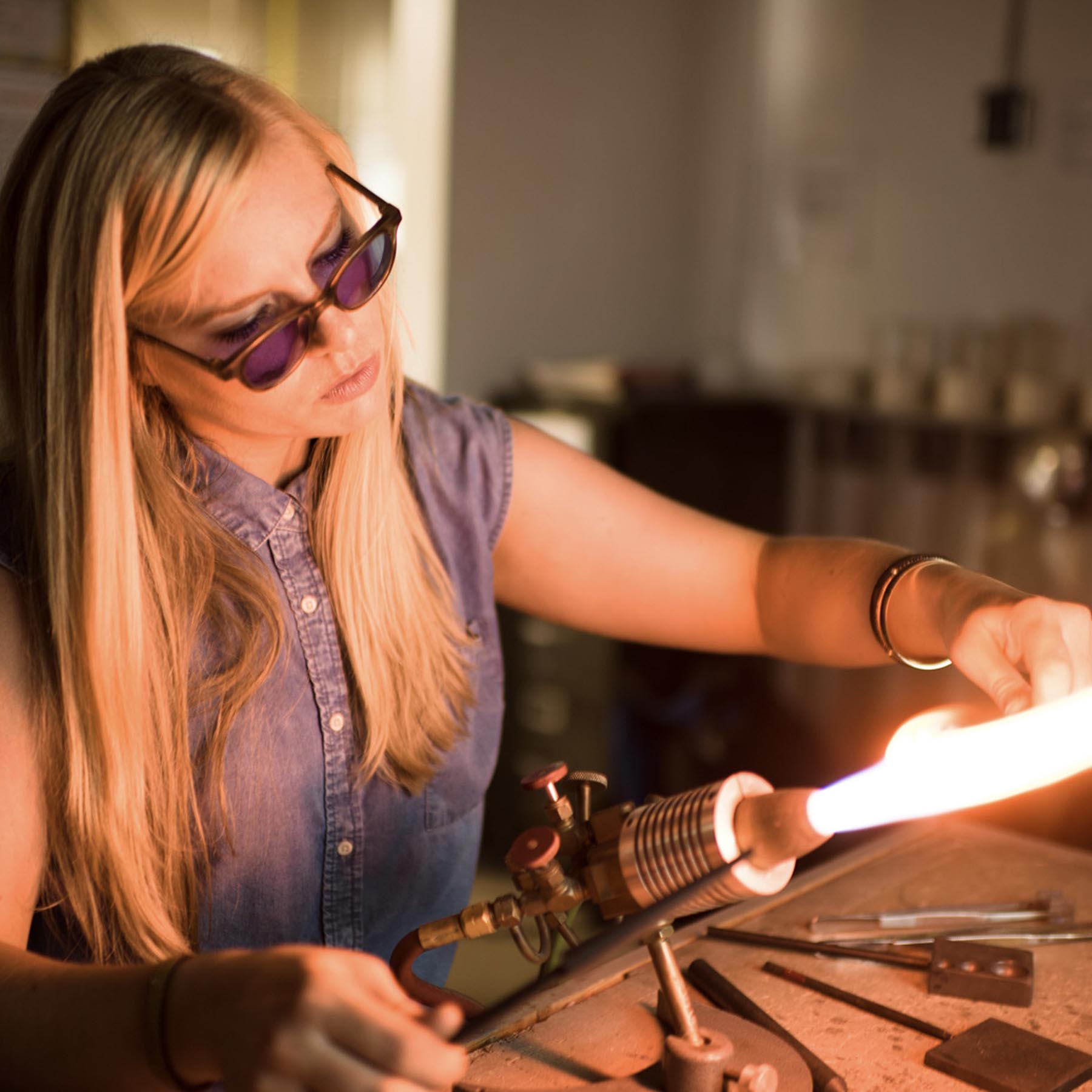 Founded in 2016 by artist Sarah Michalik and entrepreneur Noah Weinert, Charged Glassworks is a labor of love. Sarah, a glass artist with 20 years of experience, is the sole designer and maker behind each piece, shaping molten glass into wearable sculptures and refined home décor. Noah, a web developer and entrepreneur, manages the digital and operational side of the business. Together, they run Charged Glassworks from their home on Boston’s North Shore, merging artistry and innovation.